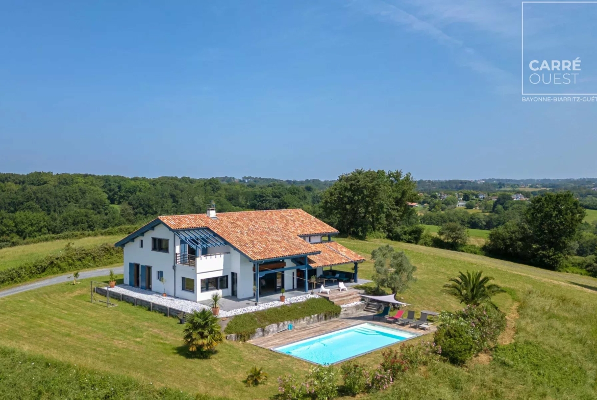 Maison à Vendre entre St Jean de Luz et Guéthary en position dominante, Magnifique Villa d’architecte , idéale pour une vie en famille ou entre amis. De très beaux espaces et des hauteurs sous plafond rendent cette maison incroyablement lumineuse et agréable à vivre.